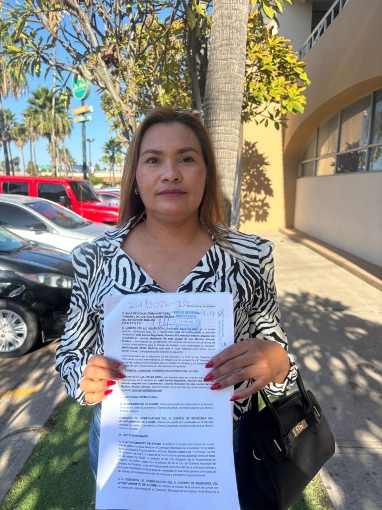 La candidata a comisaría municipal en el Ejido 18 de Marzo Janeth Citlali Vélez Soto presentó una denuncia ante el Tribunal de Justicia Administrativa, ante el supuesto abuso de autoridad cometido por tres regidores del Ayuntamiento de Ahome quienes arbitrariamente cancelaron el plebiscito realizado el pasado domingo.
