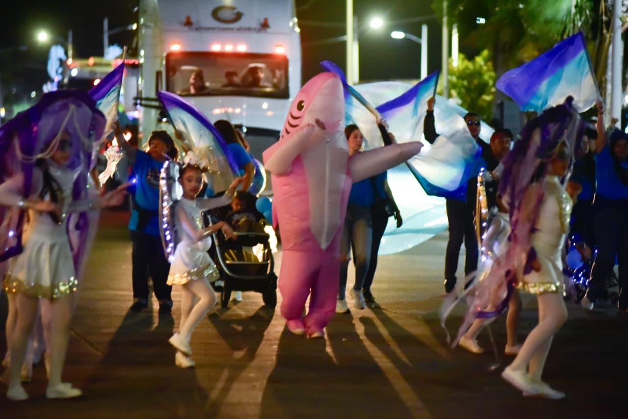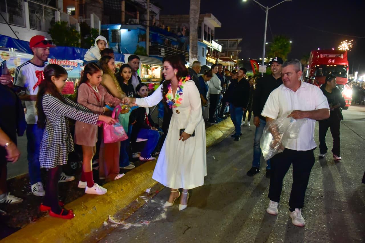 Antonio Menéndez se desfiló al frente del contingente acompañado de sus hijas y de algunos funcionarios quienes a su paso el Malecón, entregó bolsas de dulces a niños que se dieron cita para ver el contingente.