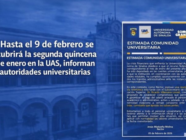 Estatal febrero 5, 2026 Hasta el 9 de febrero se cubrirá la segunda quincena de enero en la UAS, informan autoridades universitarias Read more