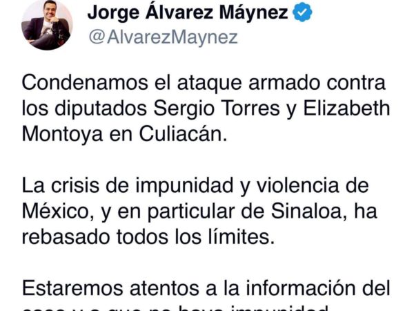 Estatal enero 28, 2026 Álvarez Máynez condena ataque contra diputados de MC en Sinaloa y advierte crisis de violencia sin control Read more