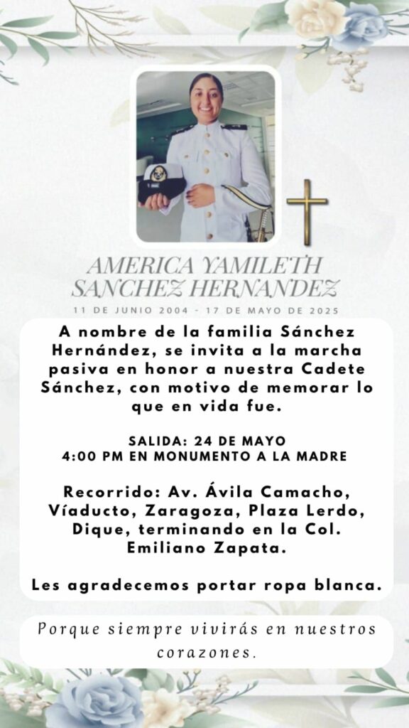 En redes sociales se anunció la realización en Xalapa de una marcha pacífica para este sábado 24 de mayo en honor a la cadete América Yamileth Sánchez, fallecida en el accidente del Buque Cuauhtémoc en el puente de Brooklyn en Nueva York.