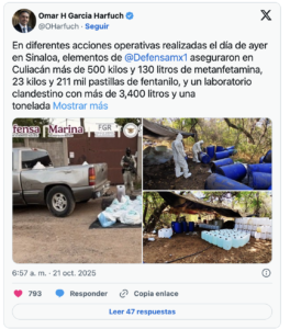 También en Culiacán, los agentes de seguridad inhabilitaron un laboratorio clandestino para elaborar metanfetamina donde destruyeron un reactor de síntesis orgánica, un contenedor metálico, dos destiladores, además de tres mil 400 litros y mil kilos de sustancias químicas, lo que representa una afectación a la delincuencia organizada por 473 millones de pesos.