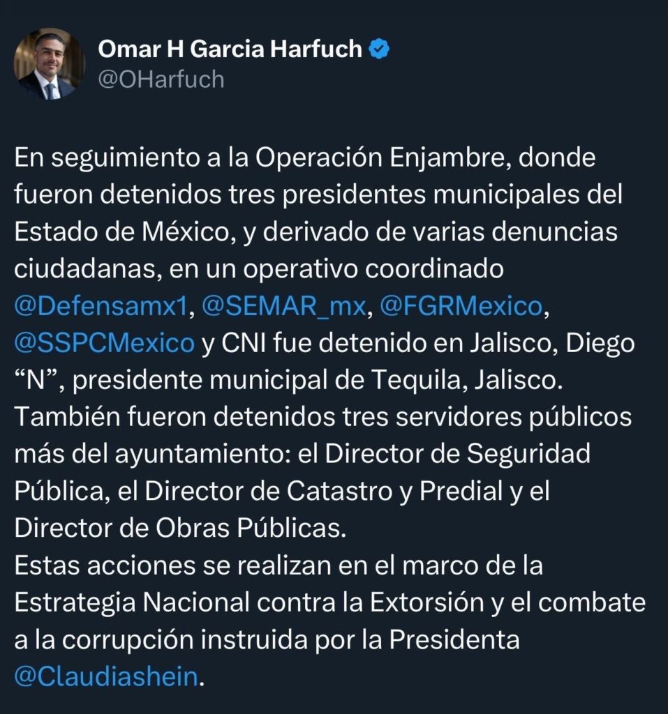 El anuncio fue realizado por el titular de la Secretaría de Seguridad y Protección Ciudadana, Omar García Harfuch, quien informó que la detención se deriva de denuncias ciudadanas y del seguimiento a la Operación Enjambre, mediante la cual previamente fueron capturados tres presidentes municipales del Estado de México.
