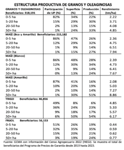 • Ineficiencia en las políticas de precios de granos y oleaginosas, así como el aumento de costos, caída en precios y falta de coberturas, provoca caída del 71% en la rentabilidad de productores en los últimos 5 años (de maíz, trigo y sorgo). Diagnóstico productivo: un campo fragmentado y desigual El Censo Agropecuario 2022 (INEGI) y los análisis de GCMA confirman que la estructura productiva nacional está profundamente fragmentada. Existen 3.5 millones de unidades de producción (UP) dedicadas a granos y oleaginosas, de las cuales 2.8 millones (82%) tienen menos de 5 hectáreas. El 74% de la superficie agrícola depende del temporal, y solo 6.1% de las UP tienen acceso a crédito, mientras que apenas 1.9% cuentan con seguro agrícola. Este panorama refleja una realidad de baja productividad y alta vulnerabilidad económica, sobre todo en los pequeños productores.