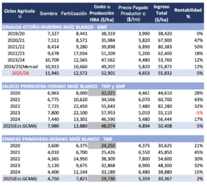 DETERIORO DE LA RENTABILIDAD DEL MAÍZ BLANCO EN SINALOA, JALISCO Y CHIAPAS DE 2020 A 2026