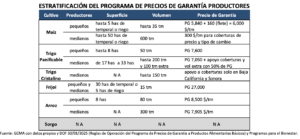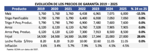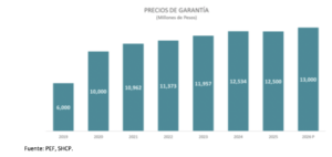 El marco legislativo establece que los precios de garantía no pueden reducirse y el programa carece de un modelo económico formal basado en mercados nacionales/internacionales o indicadores como futuros. Destaca la caída del 15.5% en el precio de garantía del maíz (2024-2025) y el aumento súbito del frijol que, junto con la producción récord estimada de más de 1 millón de tm, reducirá su precio a $14/kg, afectando a los productores del programa.