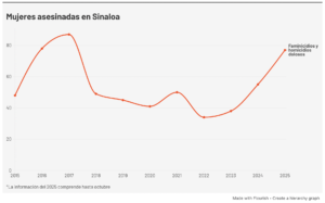 De acuerdo a datos de la Fiscalía General del Estado de enero a octubre de 2025, 77 mujeres han sido víctimas de feminicidio y homicidio doloso en Sinaloa. La mayoría han ocurrido en Culiacán, Navolato, Mazatlán y Ahome, municipios que junto a Guasave tienen activa la Alerta de Violencia de Género.