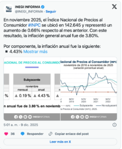 Inflación en México acelera a 3.80 por ciento durante noviembre de 2025