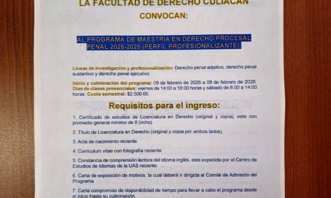 07-01-2026.-Arranca el registro, recepción de documentos y entrevistas para el ingreso al Programa de Maestría en Derecho Procesal Penal 2026–2028 perfil profesionalizante, que ofrece la Universidad Autónoma de Sinaloa (UAS) a través de la Unidad de Posgrado de la Facultad de Derecho Culiacán, dirigido a profesionistas interesados en fortalecer su formación especializada en el ámbito del derecho penal.