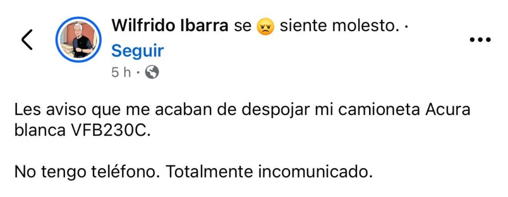 En una breve publicación, el comunicador informó que fue despojado de su camioneta Acura blanca, con placas VFB-230C, mientras se trasladaba por la ciudad. Agregó que actualmente se encuentra sin teléfono celular, aunque no precisó el sector exacto donde ocurrió el hecho.
