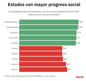 En el Índice de Progreso Social 2025, que otorga una calificación máxima de 100 puntos, la Ciudad de México, Aguascalientes, Querétaro, Nuevo León y Coahuila reportaron la mejor calidad de vida, con un promedio de 72 puntos.