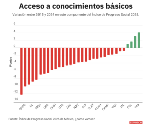 En cuanto a educación, la matriculación escolar básica está por debajo de los niveles prepandemia, señala el informe. Y, de 2015 a 2024, solo cuatro estados registraron avances en el acceso a conocimientos básicos: Tabasco, Sinaloa, Colima y Aguascalientes.