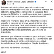 “Nosotros defendemos la doctrina Estrada y lo que representa la política exterior de nuestro país, que está en contra de las intervenciones y a favor de la solución pacífica de cualquier conflicto”, afirmó.