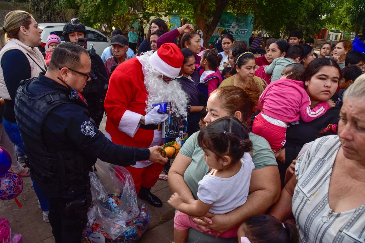 Los Mochis, Ahome, Sinaloa. A 24 de Diciembre de 2025.- Desde las instalaciones de la Secretaría de Seguridad y Protección Ciudadana del Municipio de Ahome, elementos operativos, administrativos y de tránsito se movilizaron a diversas comunidades y colonias del municipio para llevar alegría a niñas y niños, como parte de la Décimo Tercera edición del Policlaus 2025.