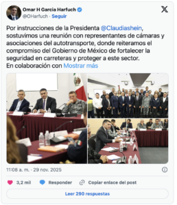 Harfuch indicó en un mensaje en X que tras el encuentro, realizado por instrucciones de la presidenta Claudia Sheinbaum, se estableció el compromiso “de fortalecer la seguridad en carreteras y proteger a este sector”.