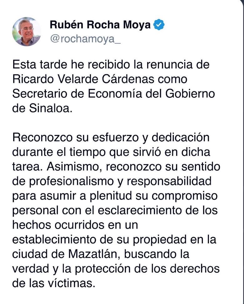 “Esta tarde he recibido la renuncia de Ricardo Velarde Cárdenas como Secretario de Economía del Gobierno de Sinaloa. Reconozco su esfuerzo y dedicación durante el tiempo que sirvió en dicha tarea. Asimismo, reconozco su sentido de profesionalismo y responsabilidad para asumir a plenitud su compromiso personal con el esclarecimiento de los hechos ocurridos en un establecimiento de su propiedad en la ciudad de Mazatlán, buscando la verdad y la protección de los derechos de las víctimas”, escribió el mandatario estatal.