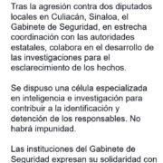 El ataque contra los legisladores ha generado condena y preocupación en el ámbito político sinaloense, al tratarse de un hecho que vuelve a evidenciar el clima de violencia e inseguridad que persiste en la entidad.