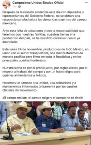El próximo lunes 24 de noviembre, agricultores de todo México, en unión con el sector transportista, se manifestarán de manera pacífica pero firme en diversos puntos de la República y en los principales puertos fronterizos.