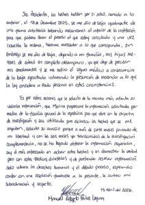 “El motivo de la presente como de las anteriores misivas es solicitar su valiosa intervención ya que se me está vulnerando el debido proceso y el derecho a una defensa adecuada”, externó.
